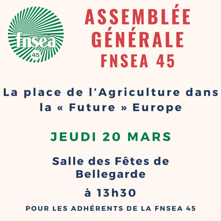 L’assemblée générale de la FNSEA 45 se déroulera jeudi 20 mars à Bellegarde, sur un thème d’actualité : l’agriculture et l’Europe. Plusieurs tables rondes sont prévues.
