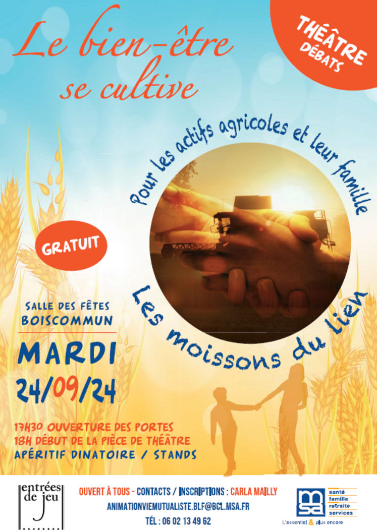 Dans le cadre du programme de prévention du mal-être agricole, la MSA et ses membres du comité technique organisent une soirée d’échanges afin de faire connaître les dispositifs et encourager les actifs agricoles à demander de l’aide. L’objectif est de faire intervenir la troupe de théâtre avec un débat sur la thématique Les moissons du lien. Venez vivre l’expérience avec d’autres actifs agricoles et leurs familles mardi 24 septembre à partir de 17 h 30 à la salle des fêtes de Boiscommun.