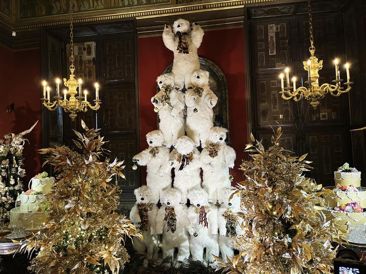 Dès l’entrée, le visiteur revêt une cape en velours rouge pour se plonger dans une visite plus immersive. Quant aux feux de cheminée allumés dans chaque pièce, ils confèrent une douceur à l’atmosphère hivernale. Tous les salons sont décorés et mettent en avant le raffinement et l’art de vivre à la française. Ainsi, on découvre une pyramide d’ours blancs animée haute de 5 mètres entourée de deux gâteaux géants au chocolat blanc. Suit le salon des Muses avec une cage dorée, un clavecin… Le détail va jusqu’aux sucres en forme de religieuses, confectionnés par Canasuc, qui accompagnent le service à thé. Un buffet à hauteur d’enfant et de multiples petits ours blancs sont installés dans l’antichambre d’Hercule.