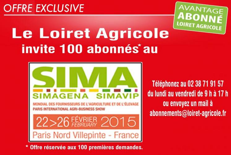 Le Sima est un moment fort pour découvrir ou confirmer ses visions de l'agriculture durable. Dans cette optique le Loiret agricole et rural a négocié des tarifs pour OFFRIR une entrée GRATUITE au SIMA 2015 à cent abonnés 2015. La valeur d'une invitation serait de 35 euros, si vous achetiez le billet à l'entrée du Salon et de 25 euros si vous la réserviez sur Internet. Autant dire que ce n'est pas une offre négligeable.