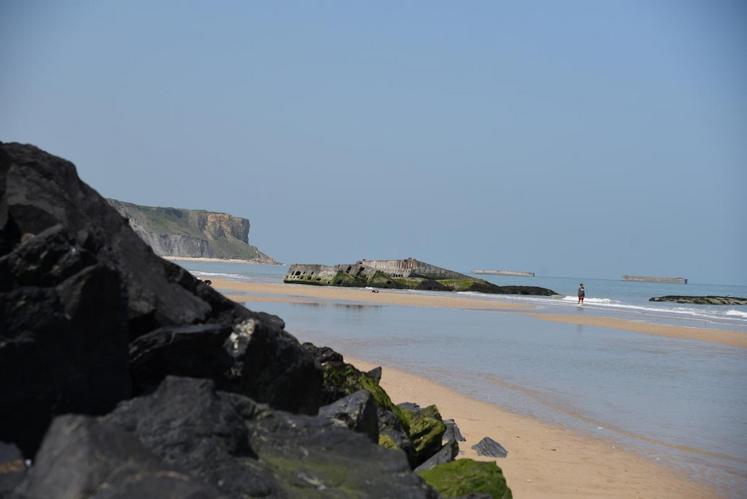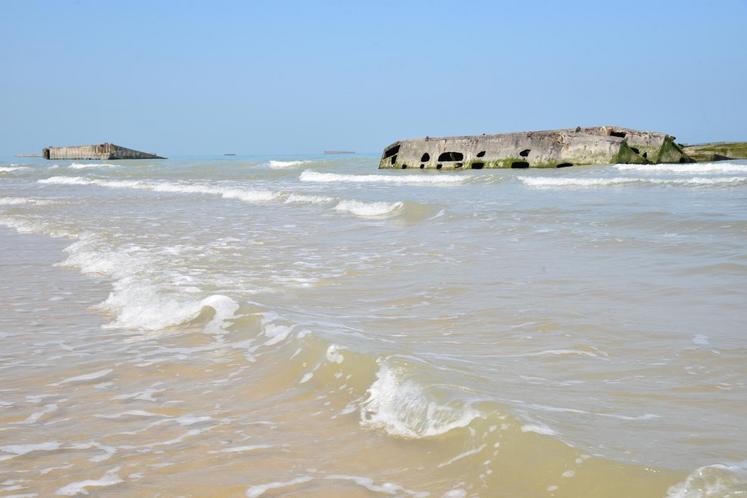 Face à Arromanches-les-Bains (Calvados), des parties du port artificiel, appelé port Mulberry, construit en juin 1944 dans les jours qui ont suivi le débarquement de Normandie du 6 juin, sont encore visibles plus de sept décennies plus tard.