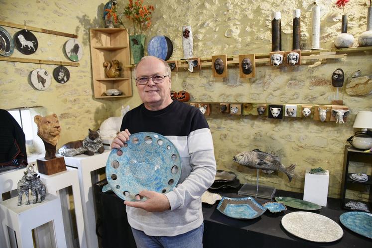 À partir de pains de terre grès blanc spécial raku, plus ou moins fins, appelés chamottes, animaux, portes-savons, saladiers, plats ou tout autre objet prennent vie sous le coup de main donné à l’aide d’ébauchoirs, mirettes, spatules… de Bruno Treni. Une première cuisson est faite dans un four à céramique. « On obtient un biscuit » note l’artiste, sourire aux lèvres.