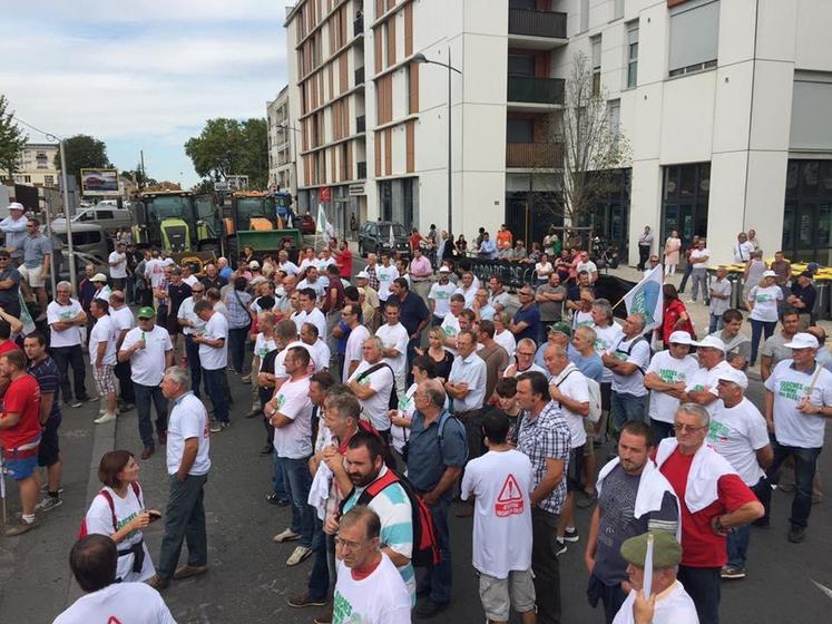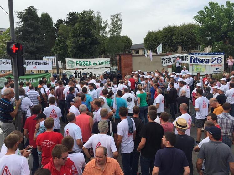 Cinq cents agriculteurs des réseaux FRSEA et Jeunes agriculteurs de la région Centre Val-de-Loire ont manifesté devant la Direction régionale de l’alimentation, de l’agriculture et de la forêt (DRAAF), à Orléans, le 14 septembre.