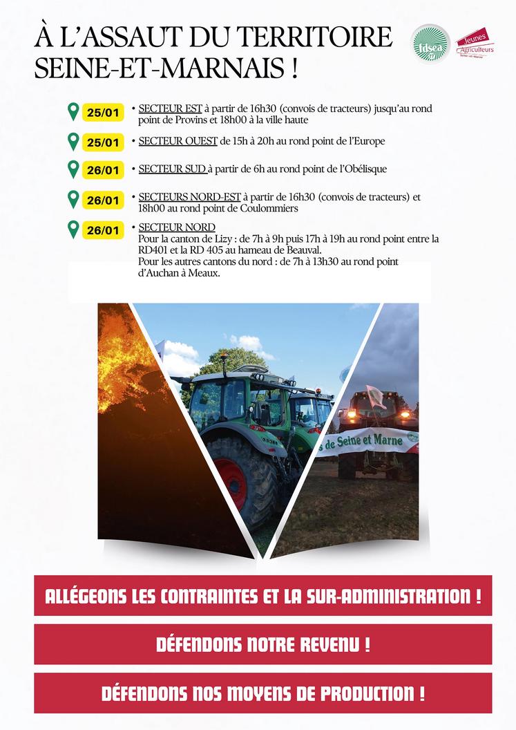 À l'appel de la FNSEA et des JA, les réseaux FDSEA 77 et JA 77 se mobilisent sur le territoire seine-et-marnais (Provins, Melun, Fontainebleau, Coulommiers et secteur de Meaux) depuis jeudi 25 janvier et pour une durée indéterminée.