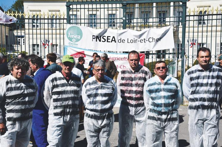 Déguisés en bagnards, Florent Leprêtre, président de la FNSEA Centre-Val de Loire, Didier Delory, président de la FNSEA 41 et son secrétaire général François-Xavier Rone, soutenus par Arnaud Bessé, président de la chambre d’Agriculture de Loir-et-Cher et Dominique Malagu, président de l’UDSEA 37, sont allés à sa rencontre pour défendre l’agriculture française.