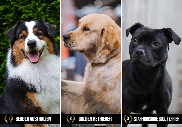 *Le top 20 est le suivant : 1. berger australien, 2. golden retriever, 3. staffordshire bull terrier, 4. chien de berger belge, 5. berger allemand, 6. retriever du Labrador, 7. cavalier king charles, 8. cocker spaniel anglais, 9. staffordshire terrier américain, 10. setter anglais, 11. beagle, 12. épagneul breton, 13. bouledogue français, 14. berger américain miniature, 15. chien de cour italien, 16. chihuahua, 17. teckel, 18. husky de Sibérie, 19. spitz allemand, 20. shih tzu.