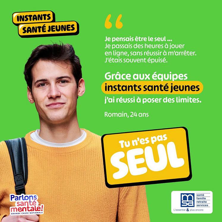 Les Instants santé jeunes de la MSA sont l’occasion d’aborder des thématiques diverses, qui ont toutes un impact sur la santé mentale : vie affective et sexuelle, addictions, sommeil, activité physique, gestion du stress, image de soi, rapport aux écrans, alimentation… Le dispositif est ainsi labellisé « Grande cause nationale : Parlons santé mentale » par le gouvernement.