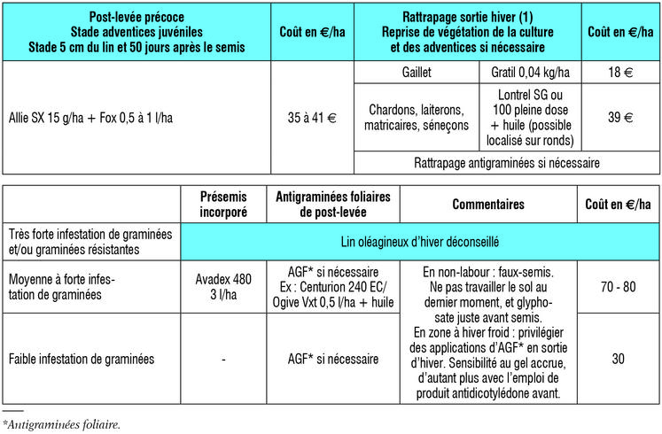 La lutte contre les dicotylédones pour le lin d’hiver se base désormais sur des produits à base de metsulfuron-methyl (Allie SX) et de bifénox (Fox). Le stade des adventices lors de l’intervention est primordial, il est conseillé de viser le stade jeune (stade cotylédons, à 4 feuilles).