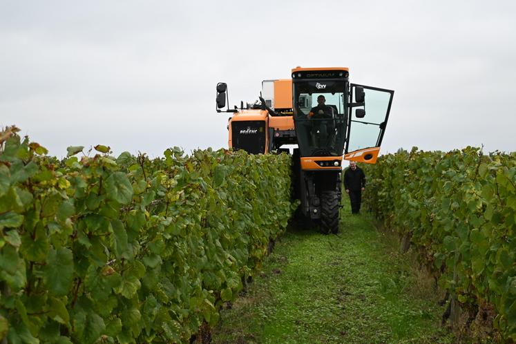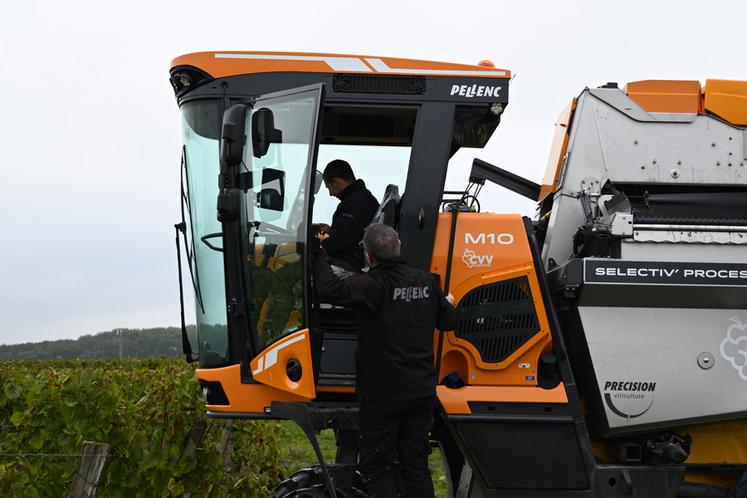 Durant la matinée, plusieurs membres de la Cuma se sont déplacés pour voir les prouesses de ce modèle de vendangeuse en action. Baptiste Chéry, vigneron et cogérant du Domaine de la Champinière, a pu tester la machine sur ses parcelles de cépages romorantin avec les conseils de Jérôme Ruel, chauffeur de démonstration chez la concession CVV, présent durant toute la démonstration.