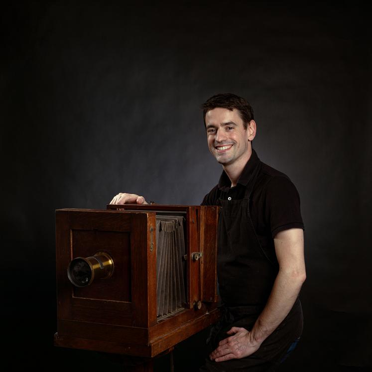 Passionné d’Histoire, il décide en 2020, en pleine période Covid, de se lancer dans les portraits au collodion humide, un procédé photographique né entre les années 1850 et 1900 qu’il fait aujourd’hui revivre. Le procédé consiste à étaler une solution de coton-poudre sur une plaque de verre ou de métal, puis à la sensibiliser au nitrate d’argent afin d'obtenir un cliché unique sur fond noir. « Je réalise ces clichés avec une chambre photographique de la fin du XIXe siècle. À une époque où nous sommes saturés d'images trop soignées, voire générées par l'intelligence artificielle, cette technique permet d'apprécier un objet unique, produit de façon artisanale, avec ses imperfections et son aspect inimitable. Il n’y a pas de retouches possibles, c’est comme un petit miracle lorsque les images apparaissent ».