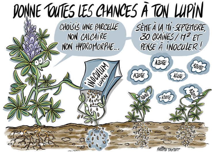 Contrairement au pois ou à la féverole, Bradyrhizobium lupini, le rhizobium spécifique au lupin, n'est pas naturellement présent dans tous les sols français. Il est donc fortement conseillé d’inoculer une parcelle portant pour la première fois du lupin, afin d’assurer son autonomie azotée.