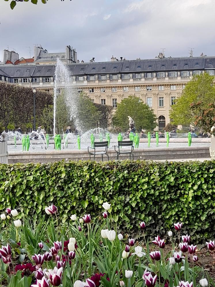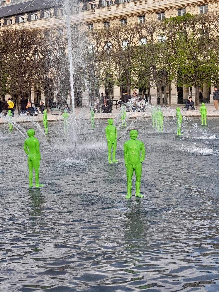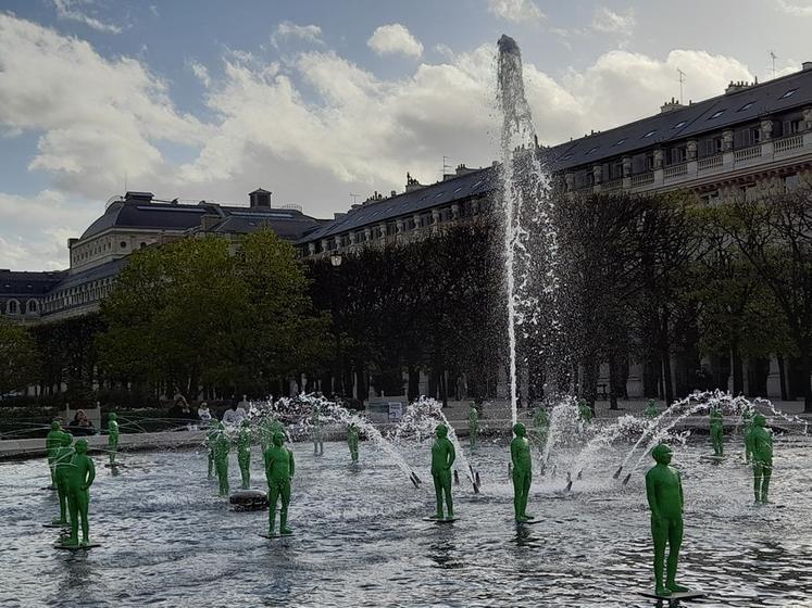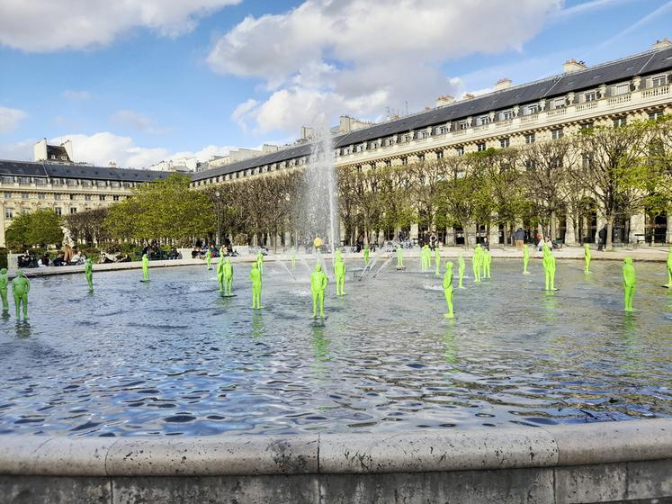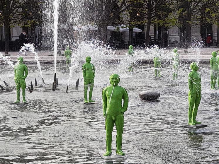 Trente petits hommes verts ont envahi la fontaine du jardin du Palais-Royal à Paris (Ier arrondissement) pour célébrer les 30 ans de la sculpture l’Homme de Bessines.