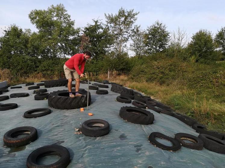 Avec Jean-Baptiste Quillet, conseiller fourrage, ils ont d’abord commencé par répertorier les différentes catégories de fourrage à disposition et à cuber les volumes d’ensilage. Les trois tas ont été métrés de long en large et en hauteur. Pour chacun, Martin de Cauwer a détaillé le contenu : sorgho de 2017 dans l’un ; un mélange raygrass hybride et trèfle violet de seconde coupe, « très épais et de super qualité », précise-t-il dans le second, et du ray grass/trèfle violet de premièrecoupe au fond du dernier, du ray grass mélangé à du méteil et trèfle violet au milieu, et méteil seul dans la dernière partie. L’éleveur comptait sur ces deux derniers tas pour assurer sa couverture hivernale. Il y a également un tas de sorgho 2018 mais le rendement est faible. Un inventaire a également été dressé pour la paille et le foin. « Je suis un peu juste en foin », estime l’éleveur. Le tour des stocks achevé, c’est à celui de l’étable et surtout des prés que le duo s’est attaqué. Le troupeau est composé de 90 vaches allaitantes- 75 salers, 15 charolaises, 19 génisses de deux ans, 28 génisses d’un an, 4 taureaux, 3 génisses en finition.