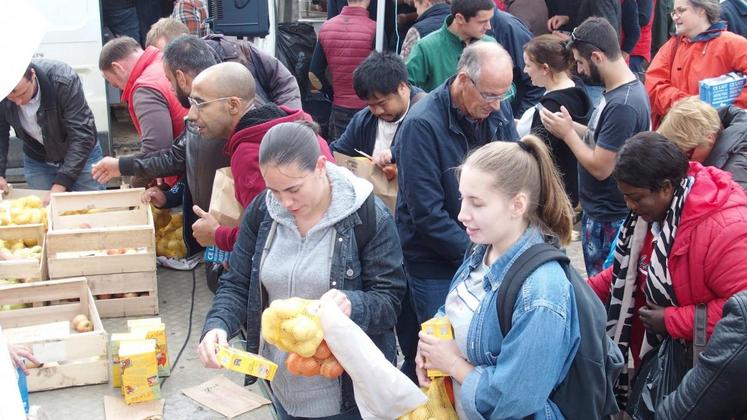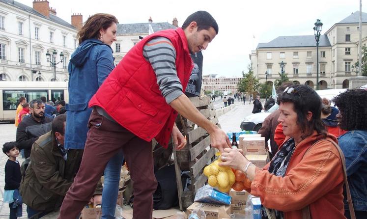 En bon ordre, le cortège a emprunté ensuite la rue du Faubourg Bannier et s’est dirigé vers la cathédrale Sainte-Croix, devant laquelle un stand de produits locaux avait été installé. Celui-ci a servi également de podium pour les prises de parole.