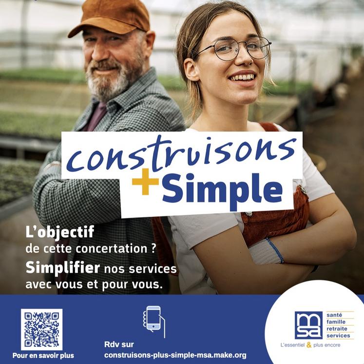 La MSA s’engage à simplifier ses services. Elle a ainsi lancé lundi 3 novembre, jusqu'au 19 décembre, une concertation nationale intitulée Construisons +Simple. Son objectif : inviter ses assurés à partager leurs expériences, leurs attentes et leurs idées, pour construire des services plus efficaces et qui répondent mieux à leurs besoins et contraintes.