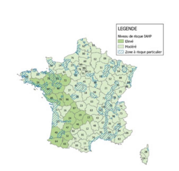 Le niveau de risque d’influenza aviaire est maintenu « élevé » dans les départements plus particulièrement concernés lors de l’épizootie 2021-2022 par des foyers IAHP en élevage et dans les départements adjacents aux départements où la situation sanitaire est évolutive. Dix-neuf départements sont concernés : Hautes-Pyrénées, Pyrénées-Atlantiques, Gers, Landes, Lot-et-Garonne, Lot, Dordogne, Cantal, Corrèze, Haute-Vienne, Vienne, Deux-Sèvres, Vendée, Loire-Atlantique, Maine-et-Loire, Sarthe, Mayenne, Ille-et-Vilaine, Morbihan.