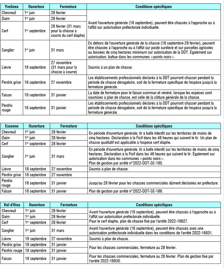 L'ouverture générale de la chasse a lieu ce dimanche 18 septembre. Retrouvez les dates d'ouverture, de fermeture et les conditions pour chaque espèce, par département d'Île-de-France ouest.