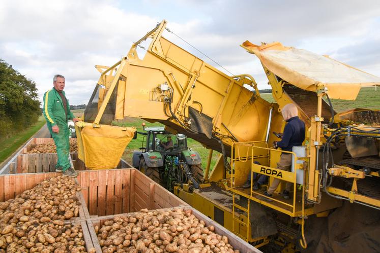 Pour mener à bien ce chantier et espérer rattraper le retard accumulé, trois arracheuses sont mobilisées, une automotrice Grimme et deux traînées Ropa. La main-d'œuvre est à l'avenant, avec les trois chauffeurs, une dizaine de trieurs, Jean-François Taupin qui assure le remplissage et le transport des palox et Grégoire Jaquemet pour la gestion de son stockage.