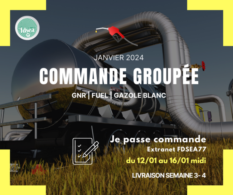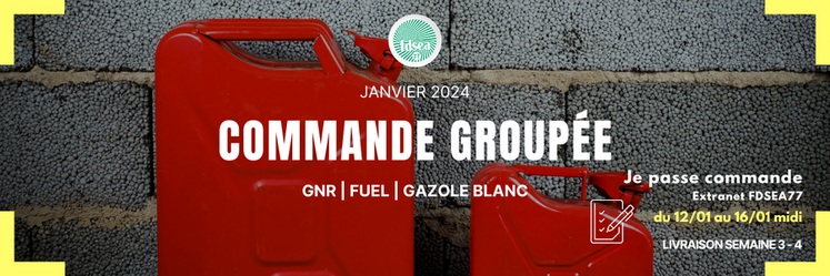- commandes de GNR qualité ordinaire et supérieure et/ou fioul domestique qualité supérieure et/ou gazole ordinaire (minimum de 1 000 litres par type de produit) du vendredi 12 au mardi 16 janvier à midi. Tous les adhérents de la FDSEA 77 peuvent passer commande ;
