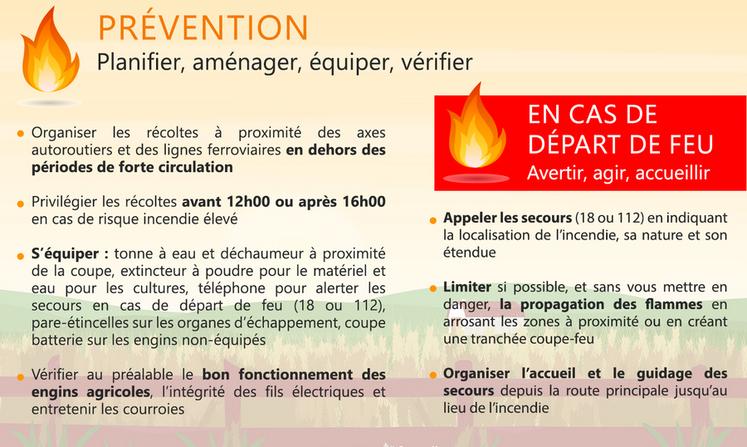 Par ailleurs, la chambre d’Agriculture rappelle que certaines actions sont recommandées en prévention d’un incendie. « Il est nécessaire de privilégier les récoltes avant midi ou après 16 heures en cas de fortes chaleurs et de risque incendie élevé. Nous conseillons également aux agriculteurs d’avoir une tonne à eau ou un déchaumeur à proximité de la coupe, ainsi qu’un extincteur à poudre et un téléphone », précise Céline Diard.