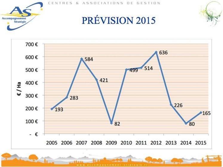 En 2015, avec un prix de 150 euros la tonne de blé et un rendement de 70 T/ha en betteraves — seule inconnue pour les rendements à ce jour —, le résultat de 2014 serait doublé (165 euros/ha) mais resterait l’un des plus faibles depuis dix ans.