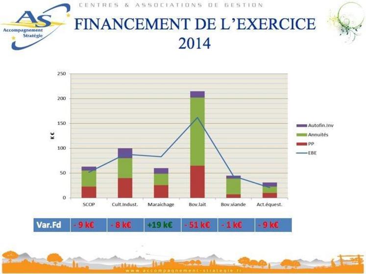 Au final, la variation du fonds de roulement est négative sauf en maraîchage. Toutefois, cette valeur se regarde sur plusieurs années : ainsi la situation reste correcte en cultures (38 % de taux d’endettement, sept mois de fonds de roulement), mais la situation est délicate en productions laitière et viande.