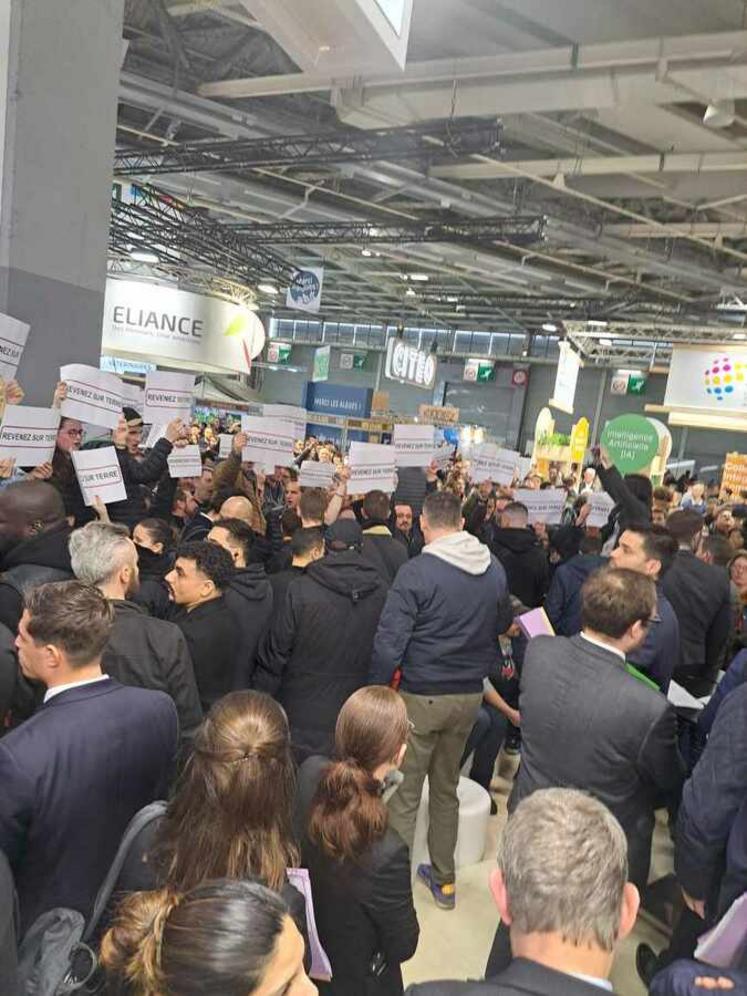 Paris, porte de Versailles, vendredi 1er mars. Les manifestants ont fortement perturbé la visite des ministres Marc Fesneau et Christophe Béchu sur les stands du ministère et en lien direct.