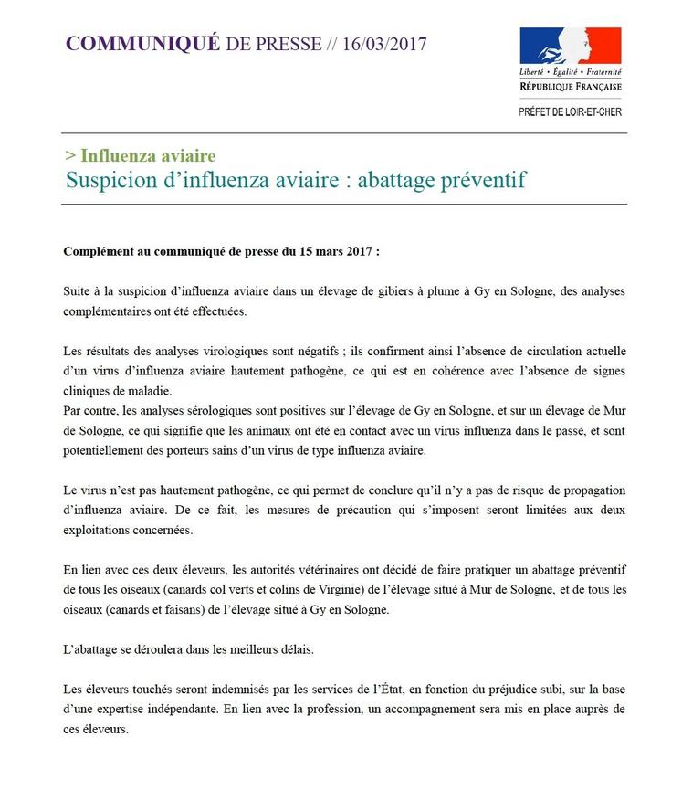 Retrouvez ci-dessous le communiqué de presse du préfet de Loir-et-Cher, daté du 16 mars, portant sur la « Suspicion d’influenza aviaire : abattage préventif ».