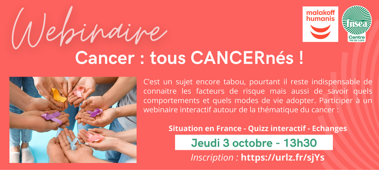 La FNSEA Centre-Val de Loire, en partenariat avec Malakoff Humanis, propose de participer à un webinaire interactif autour de la thématique du cancer jeudi 3 octobre de 13 h 30 à 14 h 30. Intitulé « Cancer : tous cancernés ! », il sera co-animé par José Mota et Mélanie Miglietti, consultants accompagnement chez Malakoff Humanis. Les participants découvriront les moyens de prévention à disposition, comment réduire les risques de survenance du cancer, mais aussi les bonnes pratiques pour soutenir un salarié concerné par la maladie.