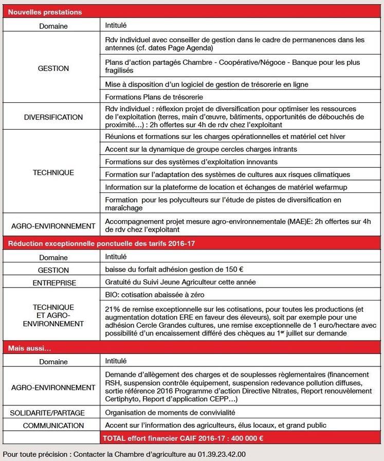 Le Bureau avait sollicité en amont les chefs de service pour élaborer des propositions d’actions sur de nouveaux services ouverts à tous les agriculteurs, mais aussi dans la réorientation du conseil pour aider à passer ce cap difficile. Les décisions votées par les élus et présentées dans le tableau ci-après, comprennent également des ristournes exceptionnelles sur les tarifs des prestations. Elles ont permis de dégager au global quatre cent mille euros du budget contraint de la chambre d’Agriculture. Ce choix est assumé pour agir à la hauteur des attentes et besoins des agriculteurs ouest-franciliens. Ceci n’est évidemment pas sans impact du fait notamment du prélèvement sur fonds de roulement subi en 2015 et l’équilibre financier de la structure se retrouve automatiquement en tension. Il nous était cependant inconcevable de ne pas mobiliser tous les leviers à disposition, et chaque ligne budgétaire a été passée au crible pour dégager les marges de manœuvre nécessaire à une réponse professionnelle à la hauteur des enjeux : permettre aux exploitants de passer ce cap difficile, entouré des compétences expertes des conseillers et chargés d’étude de la chambre d’Agriculture. La communication pour être au plus près des agriculteurs et les moments de convivialité n’ont, par ailleurs, pas été oubliés du plan d’action des membres du Bureau.