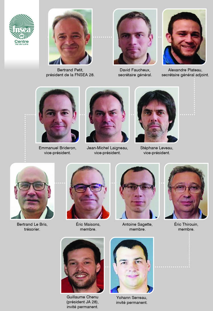 Le bureau élu par le conseil d'administration se compose des douze membres suivants : président : Bertrand Petit ; secrétaire général : David Faucheux ; secrétaire général adjoint : Alexandre Plateau ; vice-présidents : Emmanuel Brideron, Jean-Michel Laigneau et Stéphane Leveau ; trésorier : Bertrand Le Bris ; membres : Éric Maisons, Antoine Sagette et Éric Thirouin ; invités permanents : Guillaume Chenu, président des Jeunes agriculteurs 28, et Yohann Serreau.