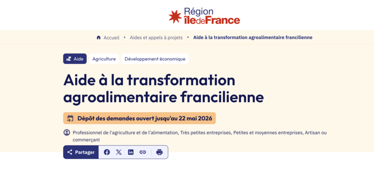 Peuvent bénéficier de cette aide : les TPE et PME (hors régime de la micro-entreprise) portant un projet agroalimentaire structurant pour le territoire et répondant aux critères européens de la TPE et PME ; les TPE et PME de collecte et de transformation de produits agricoles ; les artisans utilisant des produits agricoles franciliens et/ou des produits iconiques du territoire ; les représentants de professionnels de l’alimentation, les associations, les syndicats représentatifs et les fédérations professionnelles portant des actions collectives à destination des entreprises franciliennes.