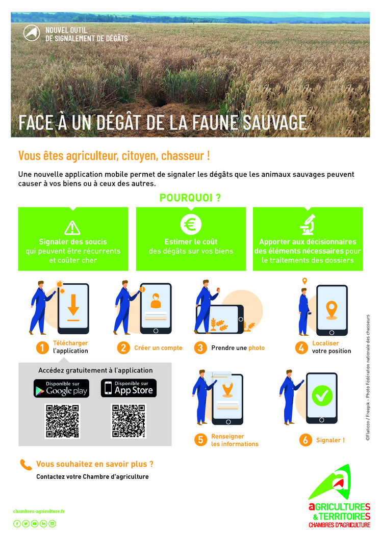 La chambre d’Agriculture d’Eure-et-Loir met à disposition des agriculteurs, chasseurs et particuliers une application (« Signaler dégâts faune sauvage ») permettant de faciliter le signalement des dégâts de la faune sauvage.