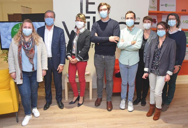 Photo : Le 9 octobre, à Châteaudun. L'équipe du Village by CA du campus Les Champs du possible, présidé par Philippe Vigier (à g.), va bichonner quatre nouvelles start-up : Agri assist, Copaille, Althur & co et Visio-crop.