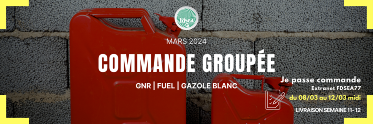 - commandes de GNR qualité ordinaire et supérieure et/ou fioul domestique qualité supérieure et/ou gazole ordinaire (minimum de 1 000 litres par type de produit) du vendredi 8 au mardi 12 mars à midi. Tous les adhérents de la FDSEA 77 peuvent passer commande ;