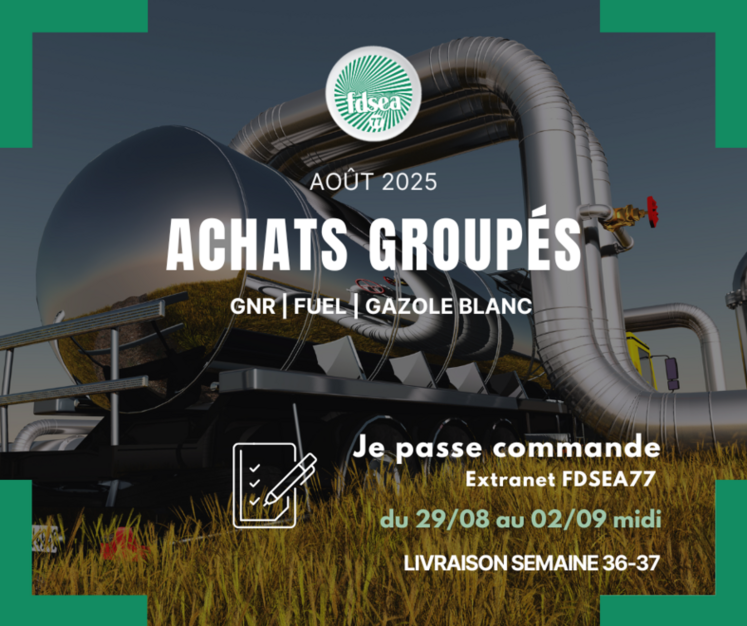 - commandes de GNR qualité ordinaire et supérieure et/ou fioul domestique qualité supérieure et/ou gazole ordinaire (minimum de 1 000 litres par type de produit) du vendredi 29 août au mardi 2 septembre à midi. Tous les adhérents de la FDSEA 77 peuvent passer commande ;