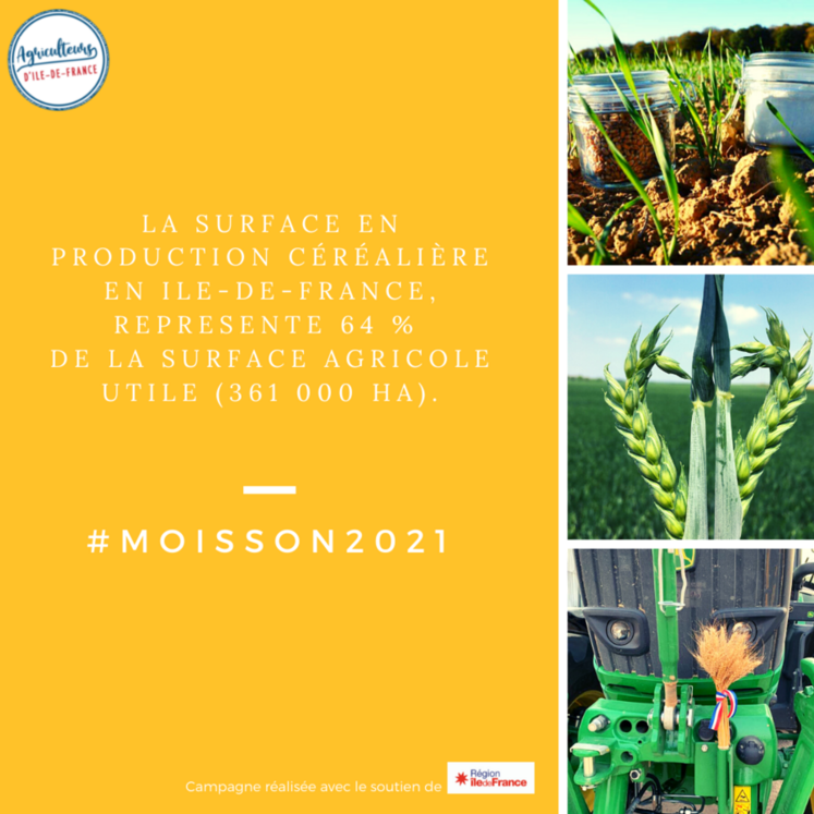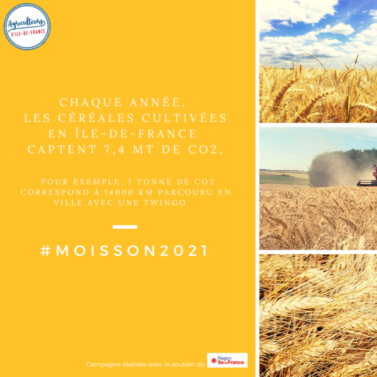 L'association Agriculteurs d'Île-de-France lance pour la deuxième année consécutive, une vaste opération de communication et de sensibilisation auprès du grand public sur la période de moisson. Réalisée avec le soutien de la Région Île-de-France, cette campagne se déroulera essentiellement sur les réseaux sociaux (Facebook, Instagram et Twitter) et mettra en lumière au fil des jours, des informations pratiques sur les récoltes à travers six visuels différents. Ainsi, on apprendra que la filière céréalière emploie à elle seule plus de 39 000 personnes en Île-de-France, qu'avec 14 % de la production française de farine, la meunerie francilienne se place au premier rang national ou encore que chaque année, les céréales cultivées en Île-de-France captent 7,4 millions de tonnes de CO2.