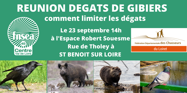 En partenariat avec la Fédération des chasseurs du Loiret, la FNSEA 45 propose aux agriculteurs une réunion d’informations sur la lutte contre les dégâts de gibiers qui se tiendra vendredi 23 septembre à 14 heures à l’espace Robert Souesme à Saint-Benoît-sur-Loire.