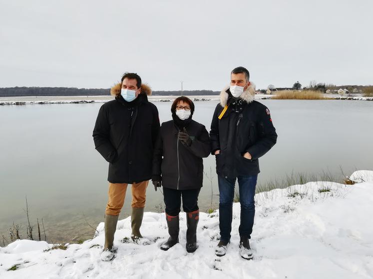 Christiane Lambert (au c.), présidente de la FNSEA, et Éric Frétillère (à g.), président d’Irrigants de France, se sont déplacés le 12 février dans le Loiret sur l’exploitation de Sébastien Méry (à d.), membre du bureau FNSEA 45, afin de tenir une conférence de presse organisée par la FNSEA CVL sur le sujet du stockage de l’eau.