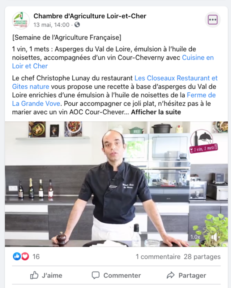 Chaque jour, du 13 au 22 mai, un post diffusé sur les comptes Facebook et Instagram de la Chambre met donc en avant un accord mets-vin et invite les internautes à reproduire la recette.