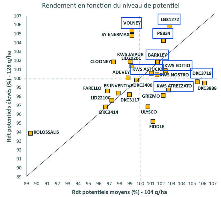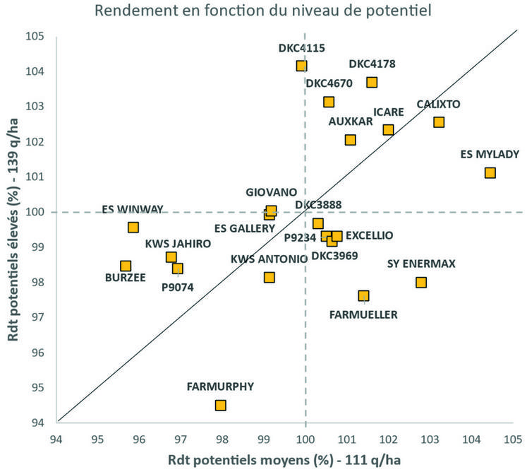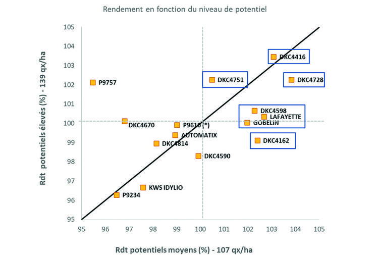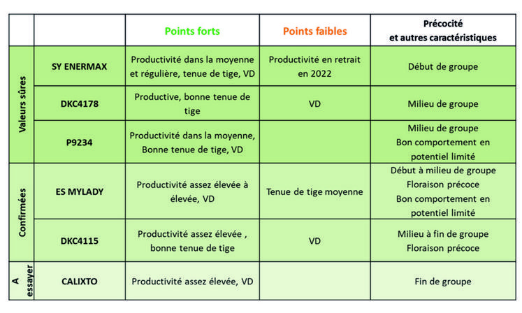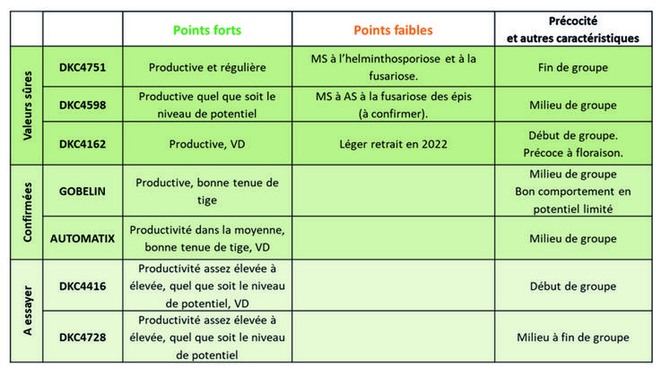 En maïs, le choix variétal se raisonne tout d’abord par une adéquation entre la précocité, la productivité et le contexte pédoclimatique de l’exploitation. Une variété plus tardive obtient en moyenne un rendement supérieur de 0,5 à 2,5 q/ha par point de tardiveté, un avantage pouvant être contrebalancé par le surcoût de charges (intrants, irrigation et frais de séchage). Il faut viser une maturité de récolte entre le 1er et le 20 octobre avec un objectif de teneur en eau du grain entre 25 et 30 %. Au-delà, les frais de séchage risquent d’amputer sérieusement le résultat économique. En situations plus limitantes (en eau ou en somme de température), les variétés plus précoces (G2 par rapport à une G3) s’expriment proportionnellement mieux. D’autres critères agronomiques, comme la sensibilité à la verse ou aux maladies ou la vigueur permettent d’affiner le choix variétal.