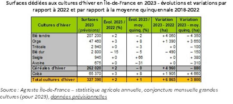 Selon les premières estimations en Île-de-France en 2023 établie par Agreste, la sole globale des céréales d’hiver (262 000 hectares) et du colza (65 370 hectares) serait en hausse de 2 % par rapport à 2022 et de 1 % par rapport à la moyenne quinquennale 2018-2022.