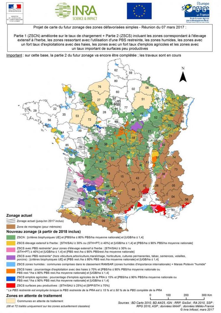 Cette nouvelle carte prend en compte des critères relatifs à l'emploi agricole, aux haies, et aux surfaces peu productives ; elle devra encore être affinée « afin de mieux cibler les territoires dont les spécificités justifient leur maintien, en particulier ceux où l'élevage est significatif », précise un communiqué du ministre, avec des critères visant à « prendre en compte les rendements céréaliers, la part des exploitations de polyculture-élevage et le niveau d'autonomie fourragère ». 85 % des communes actuellement classées en ZDS entrent dans le nouveau zonage, et d'autres pourront encore être ajoutées, avec des conséquences néanmoins sur le niveau des aides. De nouvelles cartes doivent être présentées début avril, et « selon l'option qui sera retenue quant au nombre total de communes classées ou à la création d'une Indemnité compensatrice de handicap naturel (ICHN) végétale, des décisions budgétaires devront être arrêtées selon le calendrier applicable à la PAC 2018, soit avant le 31 juillet 2017 », précise également le ministère.