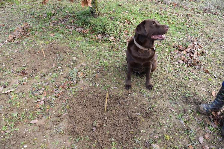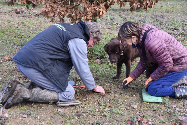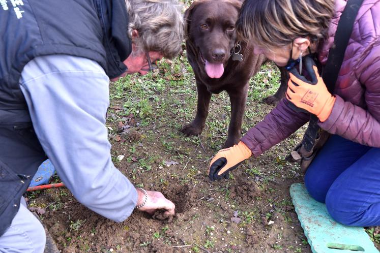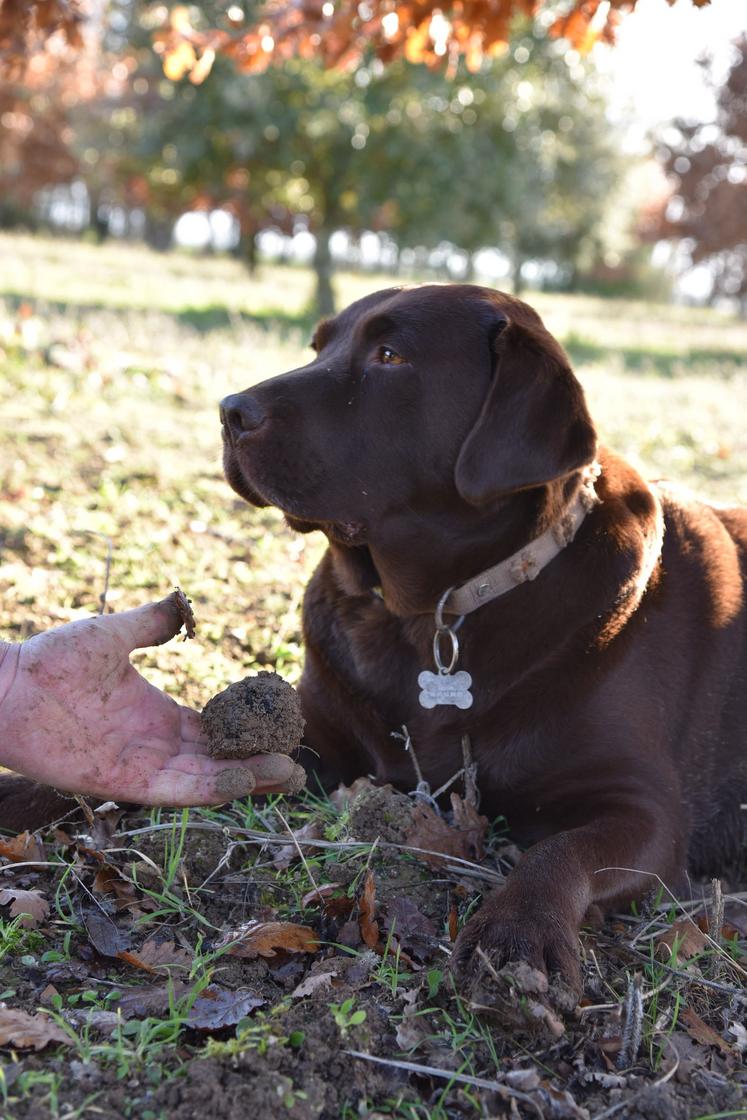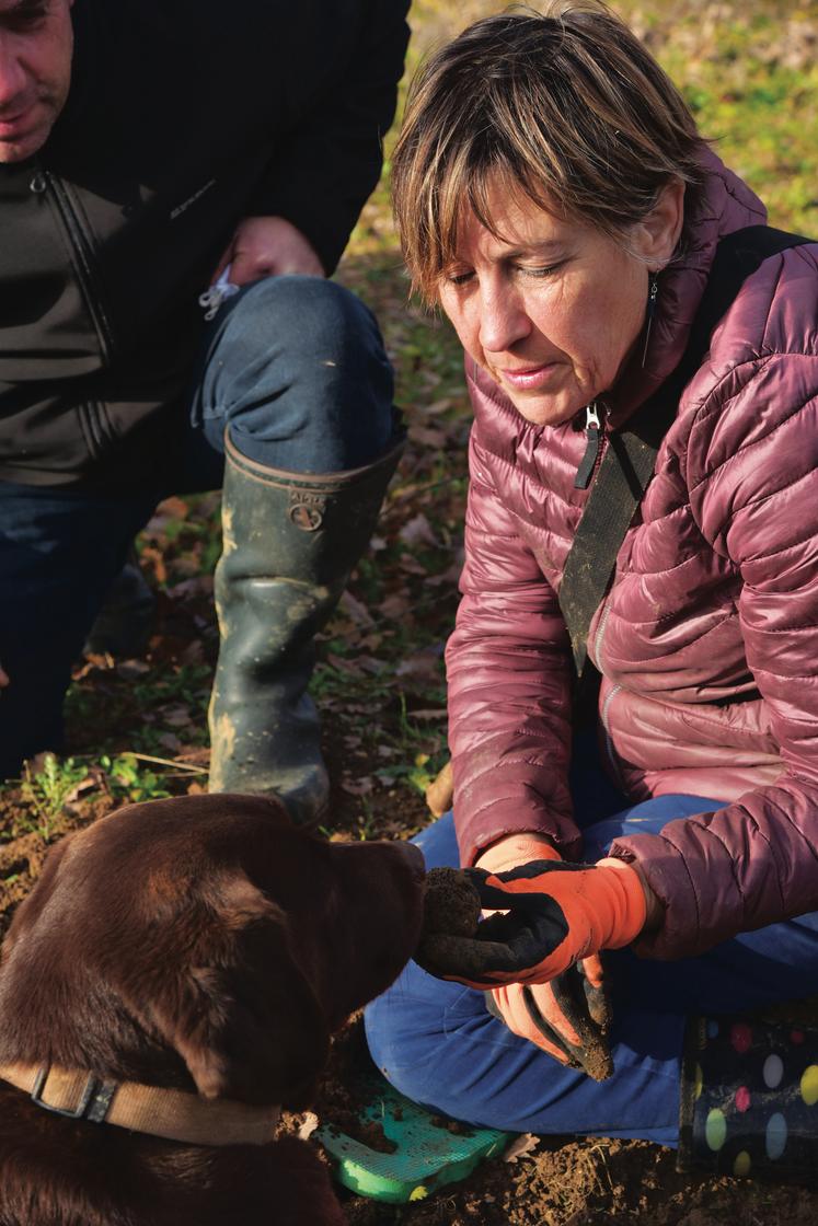 Marie-Christine Ligouis est une véritable passionnée. À Sougy, son terrain compte 450 arbres truffiers sur 1,5 ha. Avec sa chienne labrador Gina, dressée spécialement pour détecter la truffe, elle espère faire une bonne récolte de diamant noir cette année.